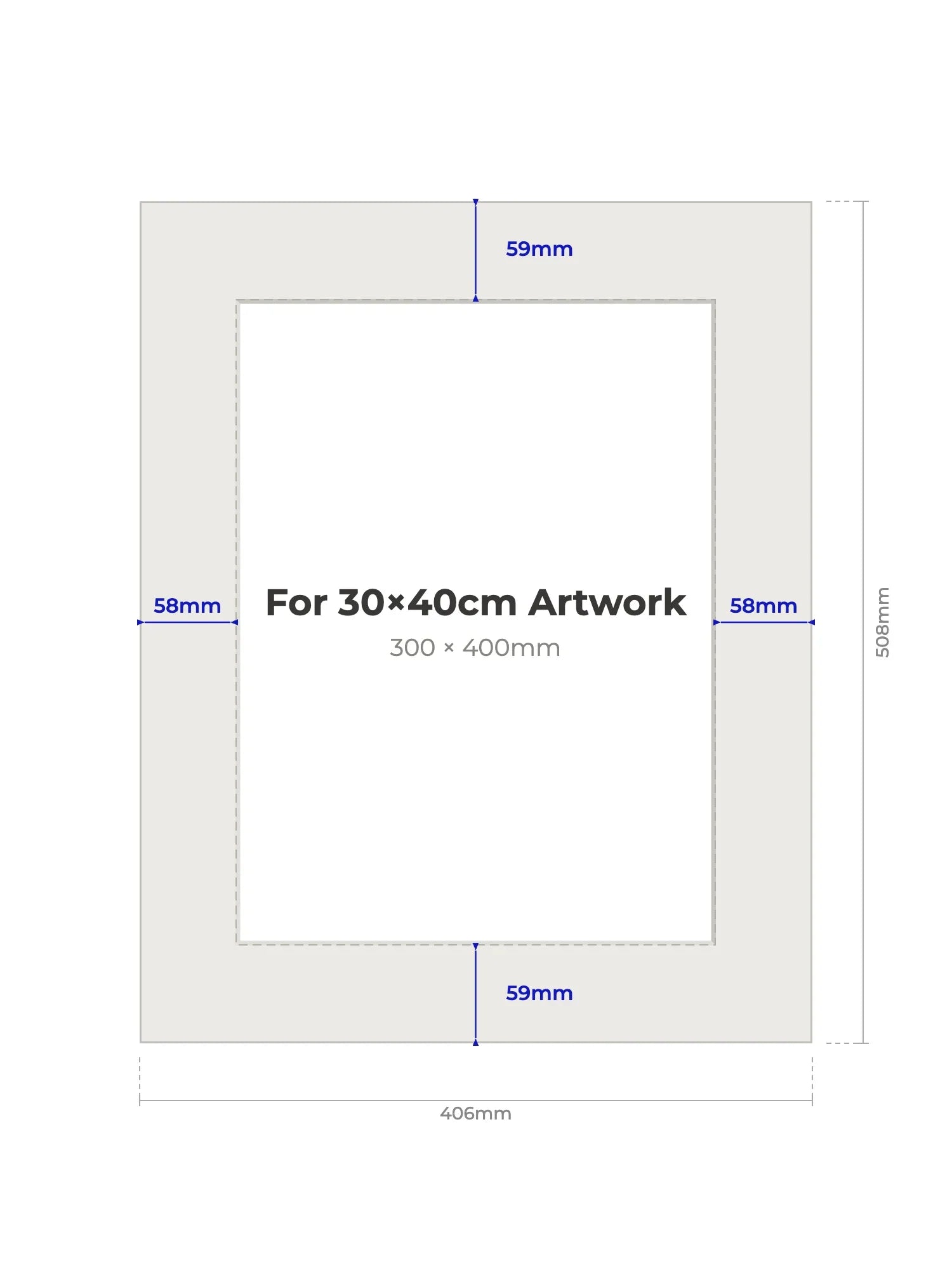 30 × 40 cm - Note, we will cut the aperture slightly smaller than the artwork size to ensure a perfect fit