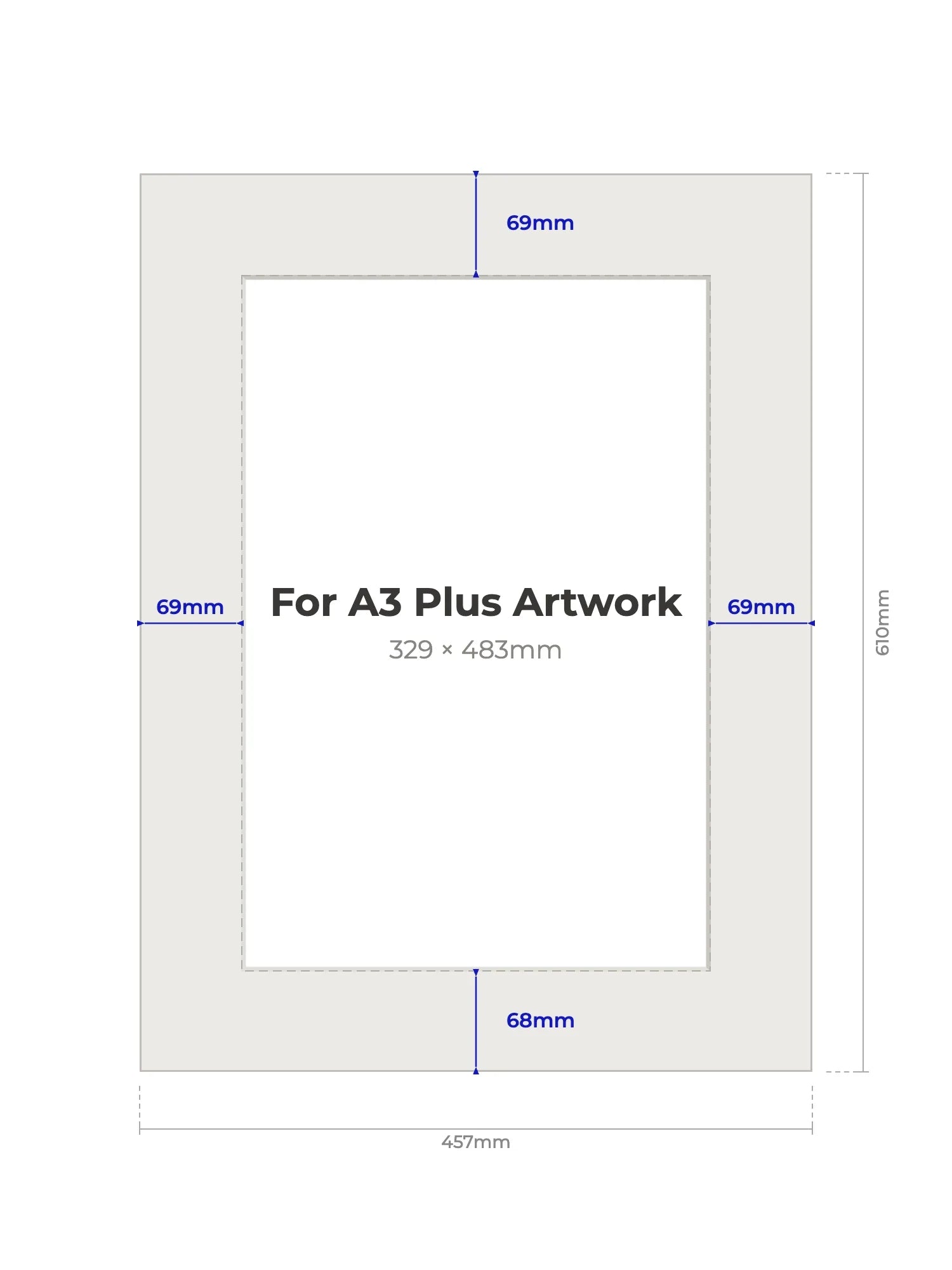 A3 Plus (329 × 483mm) - Note, we will cut the aperture slightly smaller than the artwork size to ensure a perfect fit