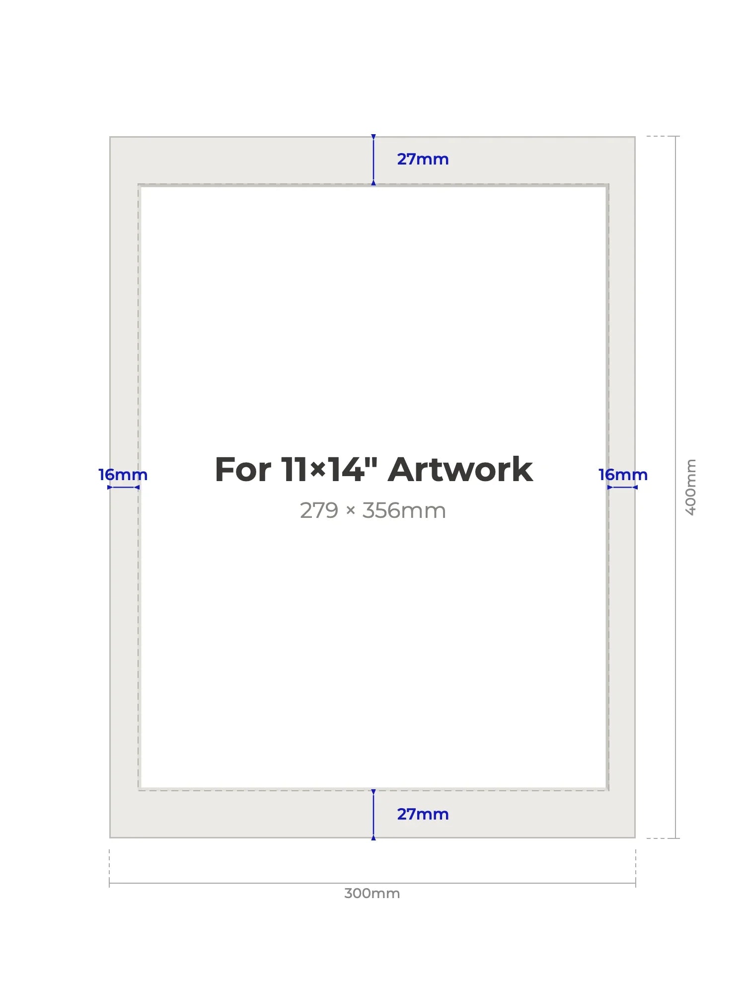 11" × 14" (279 × 356mm) - Note, we will cut the aperture slightly smaller than the artwork size to ensure a perfect fit