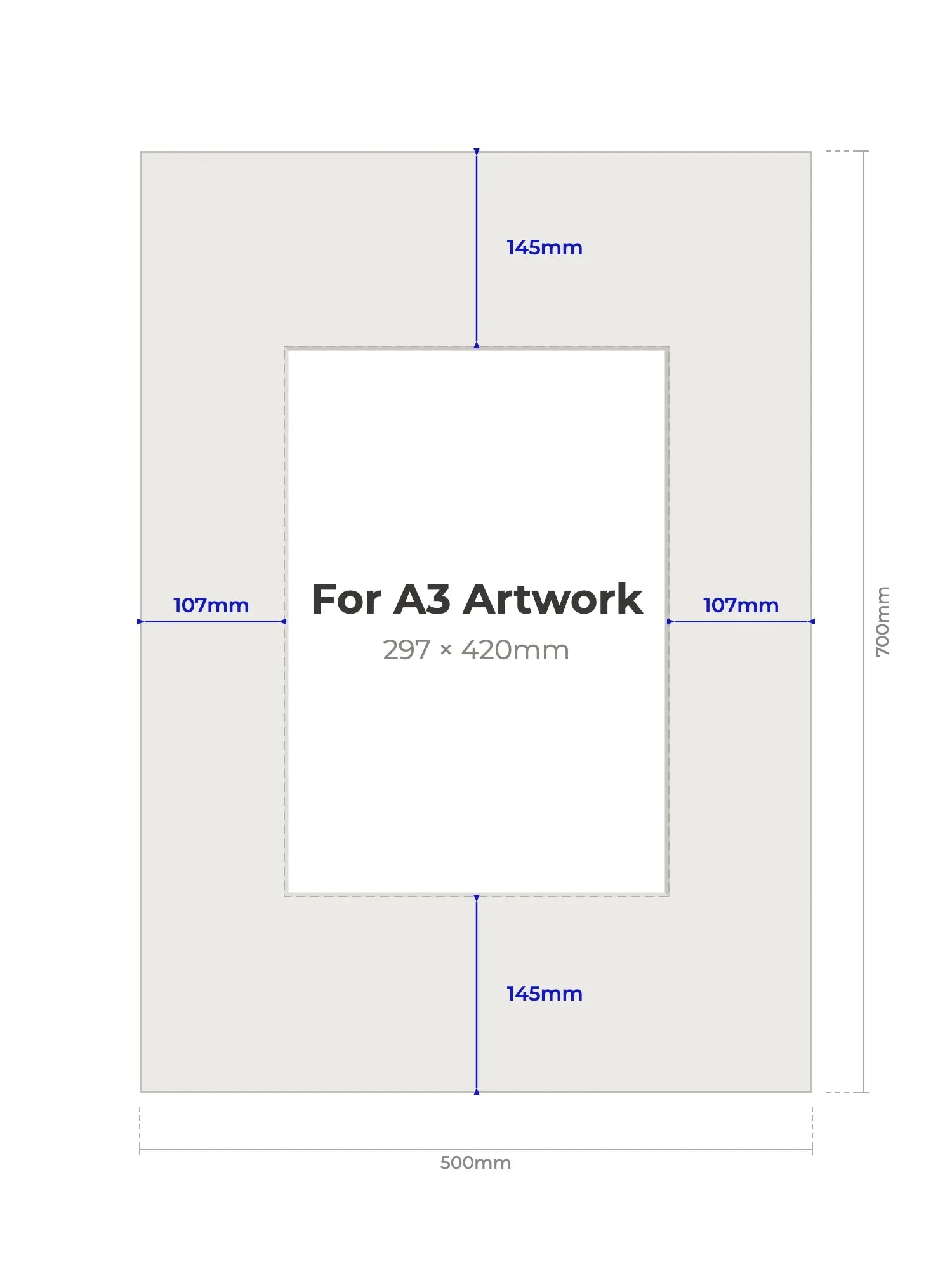 A3 (297 × 420mm) - Note, we will cut the aperture slightly smaller than the artwork size to ensure a perfect fit