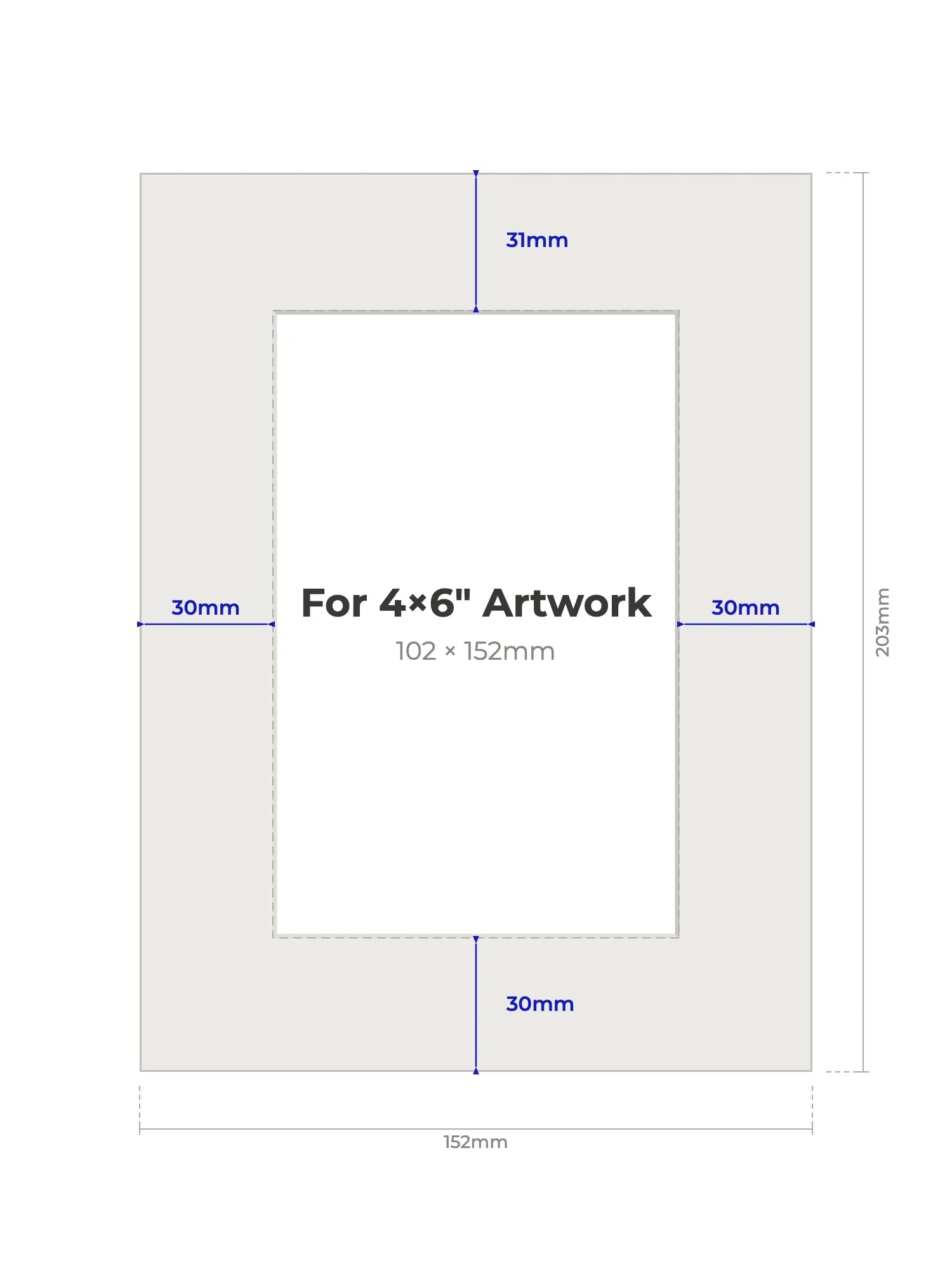 1. Before ordering, it’s worth double-checking your measurements. Measure the full width and height of your artwork, as this is the size the mount window is designed to hold. The window is cut slightly smaller than the artwork so it sits securely behind the mount board. This mount will be made to fit an artwork measuring 4" × 6" (102 × 152mm).