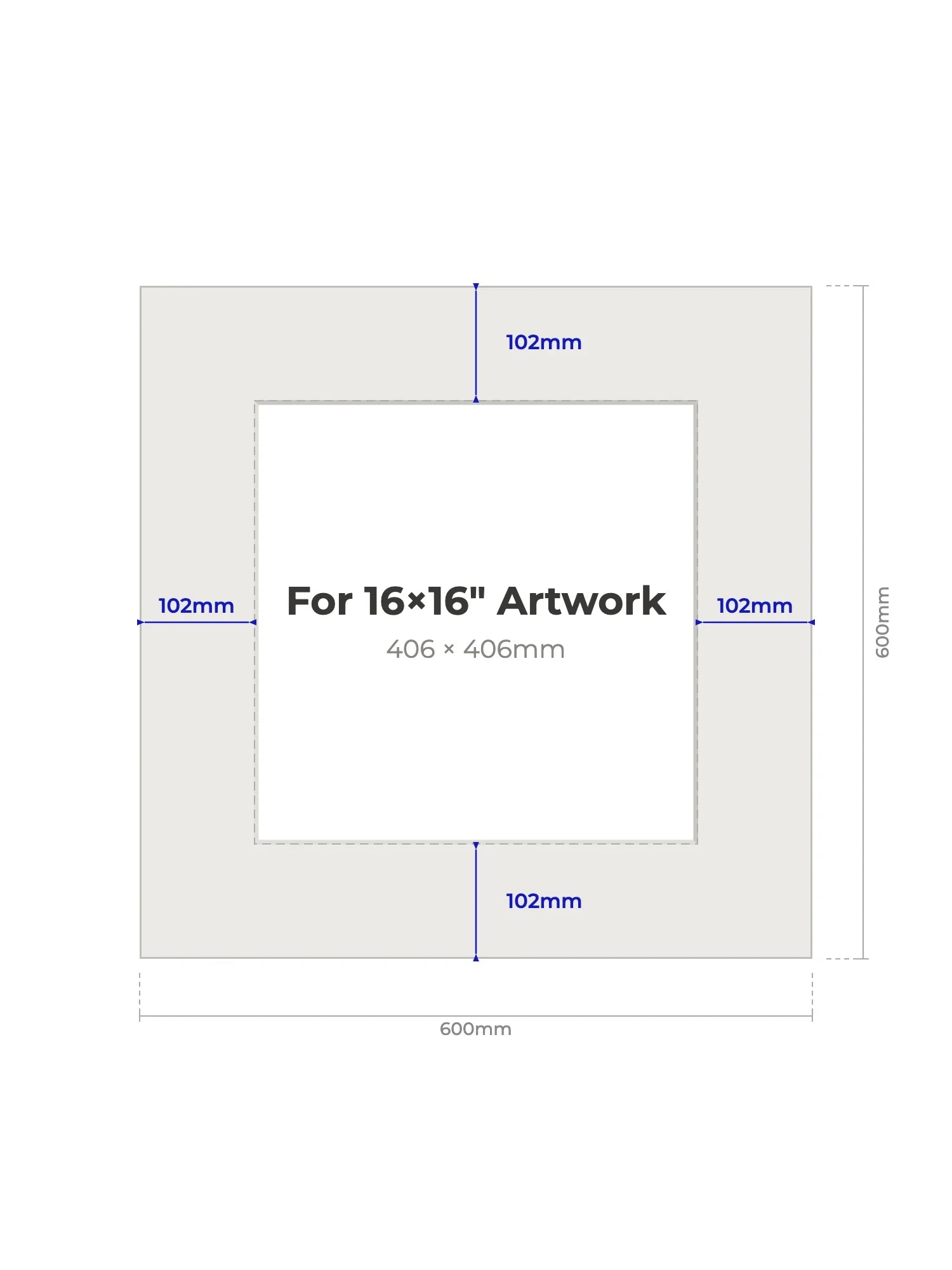 406 × 406mm - Note, we will cut the aperture slightly smaller than the artwork size to ensure a perfect fit