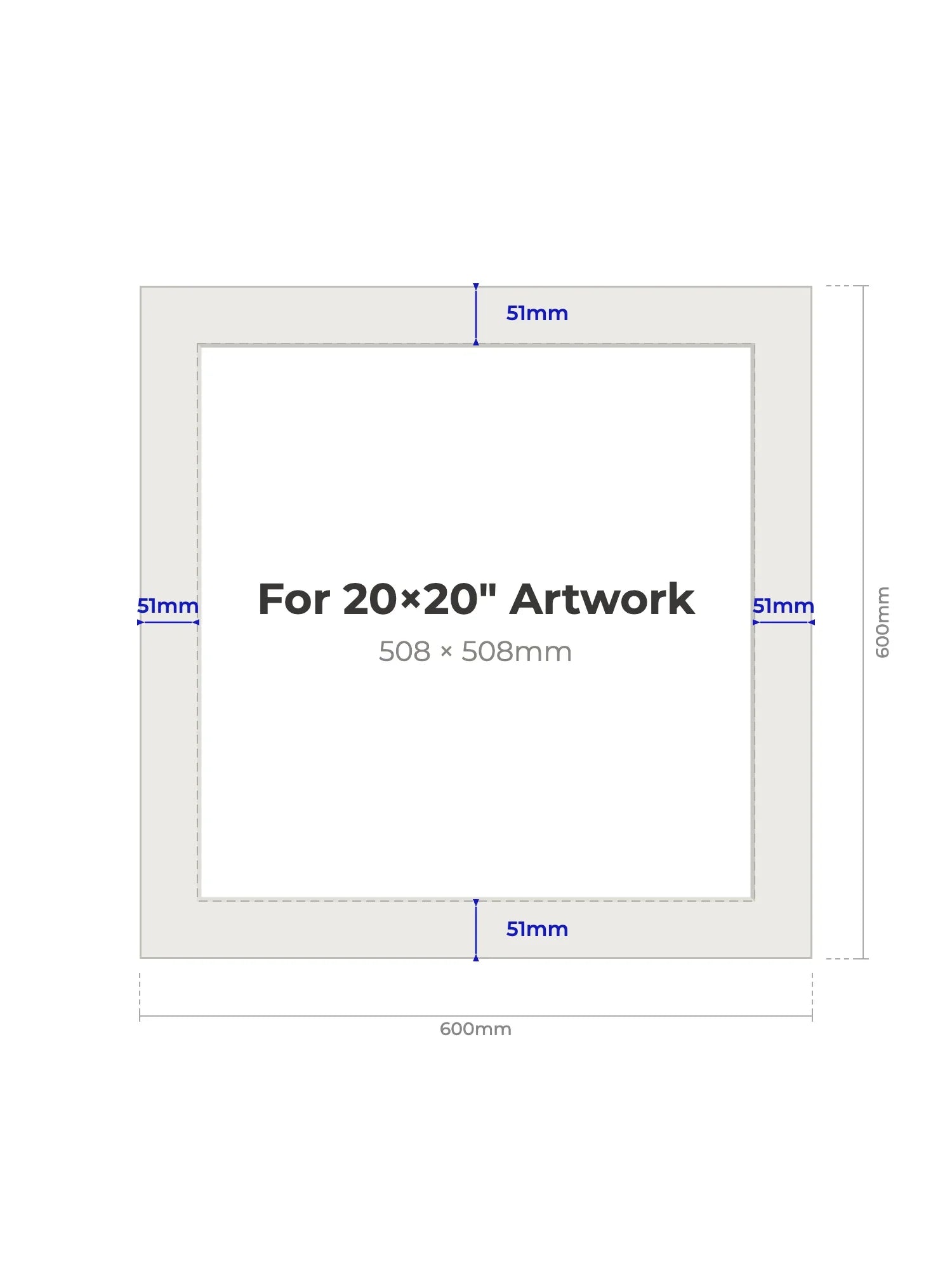 508 × 508mm - Note, we will cut the aperture slightly smaller than the artwork size to ensure a perfect fit