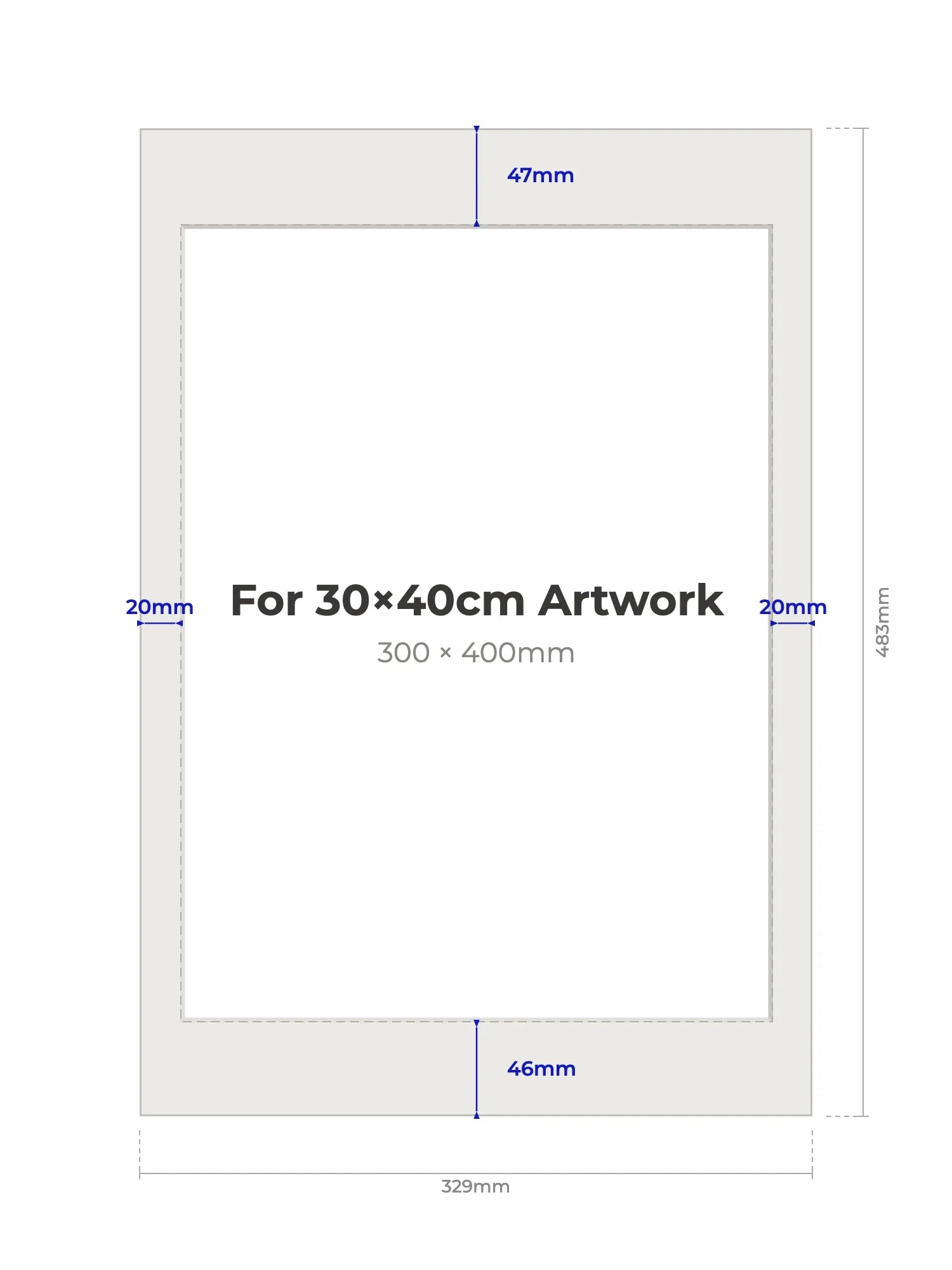 30 × 40 cm - Note, we will cut the aperture slightly smaller than the artwork size to ensure a perfect fit